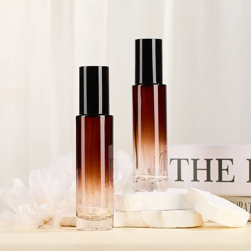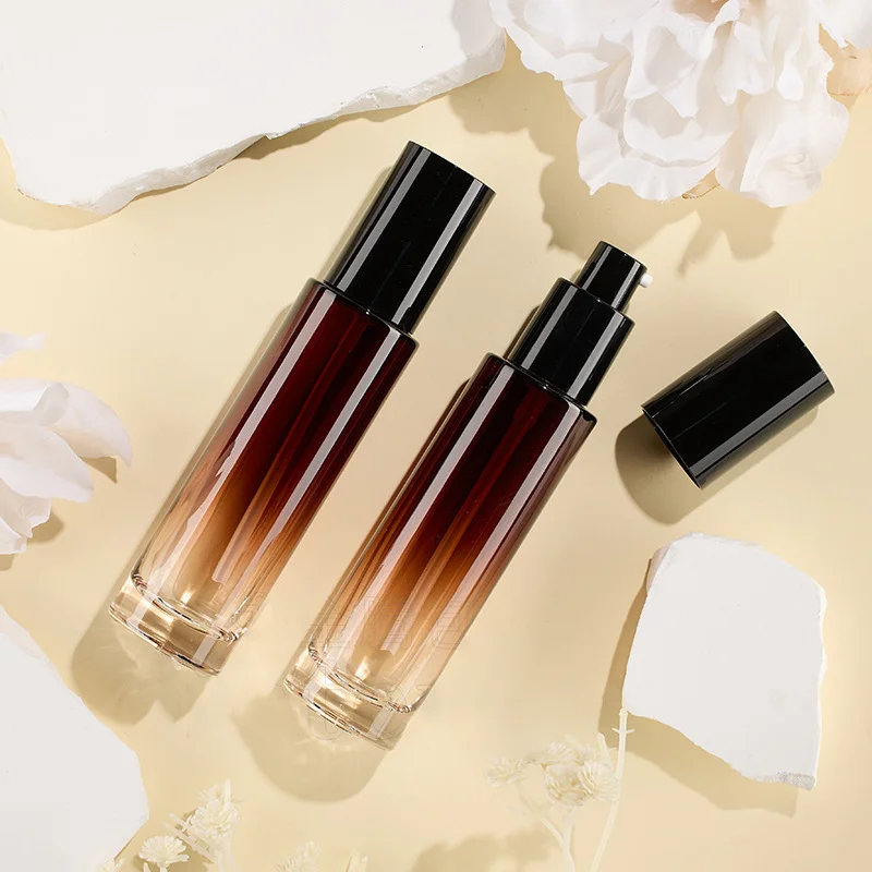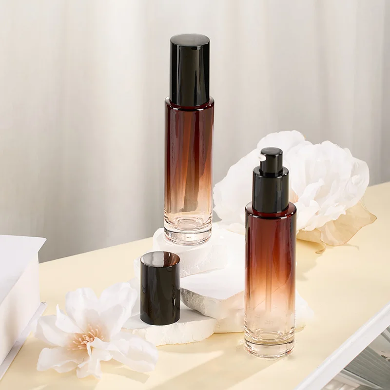 This set of coffee-colored gradient glass cosmetic packaging bottles is designed for beauty enthusiasts who pursue quality. It perfectly combines practical functions with aesthetic design. The surface of the bottle has undergone meticulous polishing, providing a smooth and delicate touch, and is easy to clean, making your skin care routine more ritualistic.
